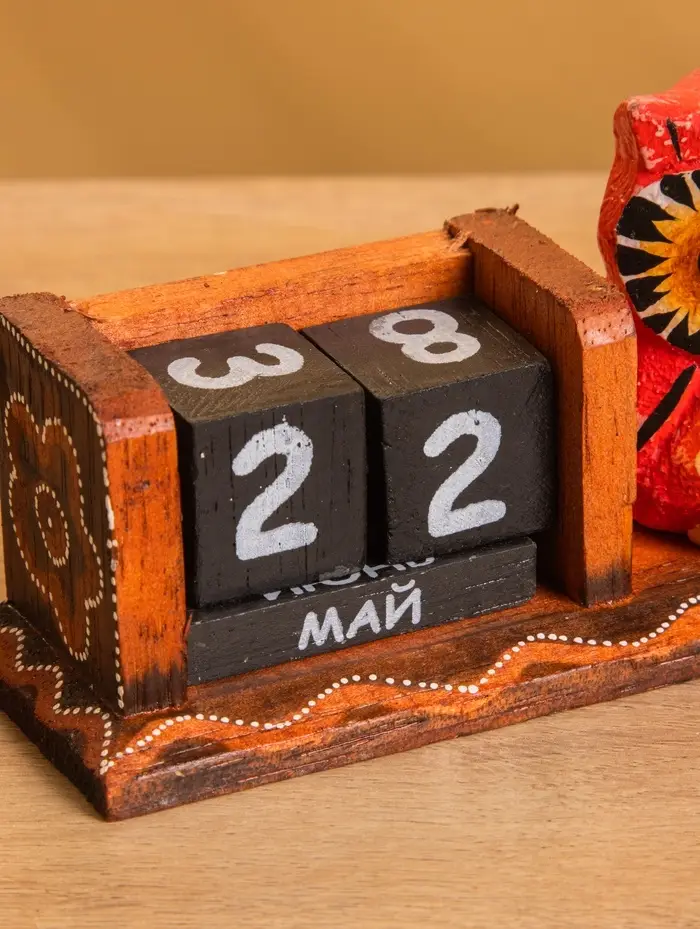 Экологичный и долговечный: Изделие изготовлено из цельного дерева, тщательно отшлифовано и покрыто безопасными красками. Механизм перестановки блоков прост и надежен. Это не просто календарь, а небольшое произведение искусства, которое привносит гармонию и порядок в ваш день. Подарите себе или близким этот символ мудрости — пусть он каждый день напоминает о важных датах и планах.