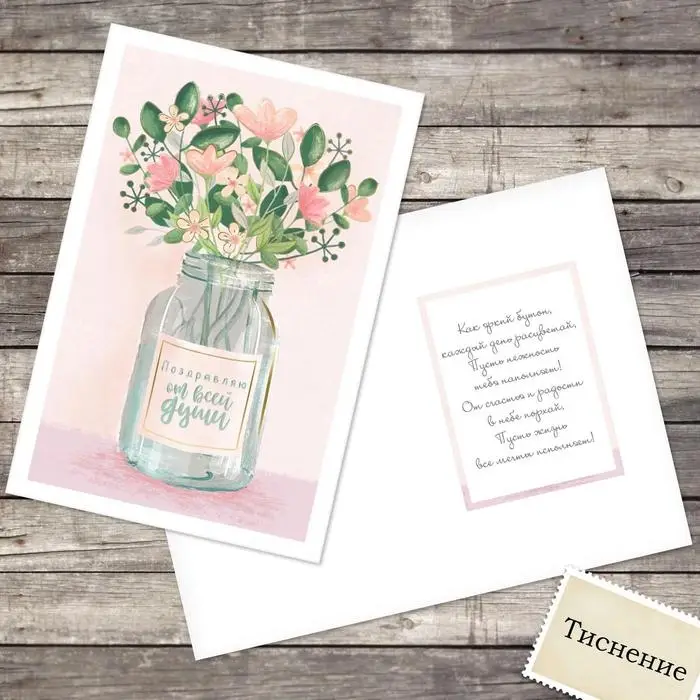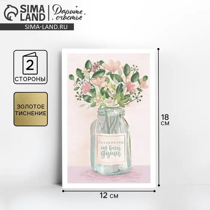 Открытка с тиснением «Поздравляю от всей души», цветы в банке, 12 х 18 см