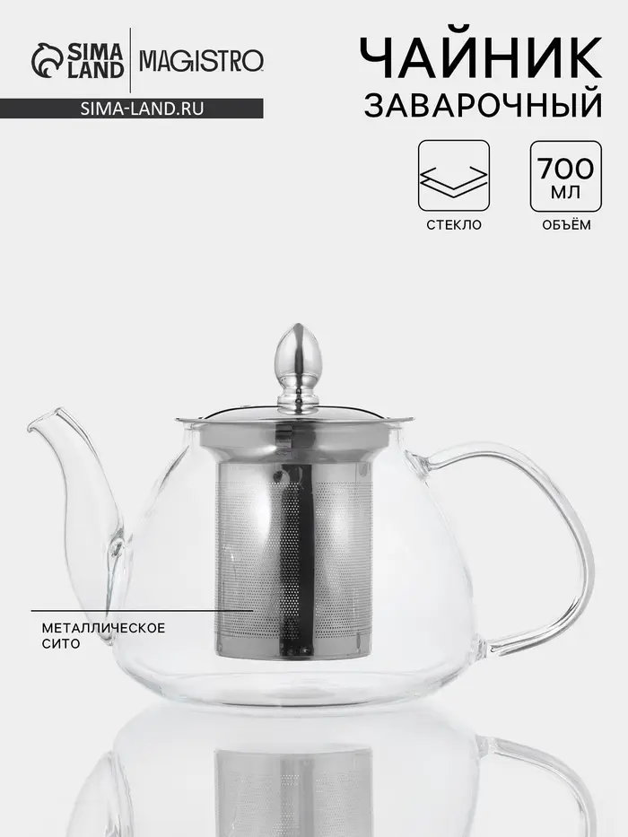 Чайник заварочный Magistro «Жак», 700 мл, 19×12×12 см, с металлическим ситом, стекло, прозрачный