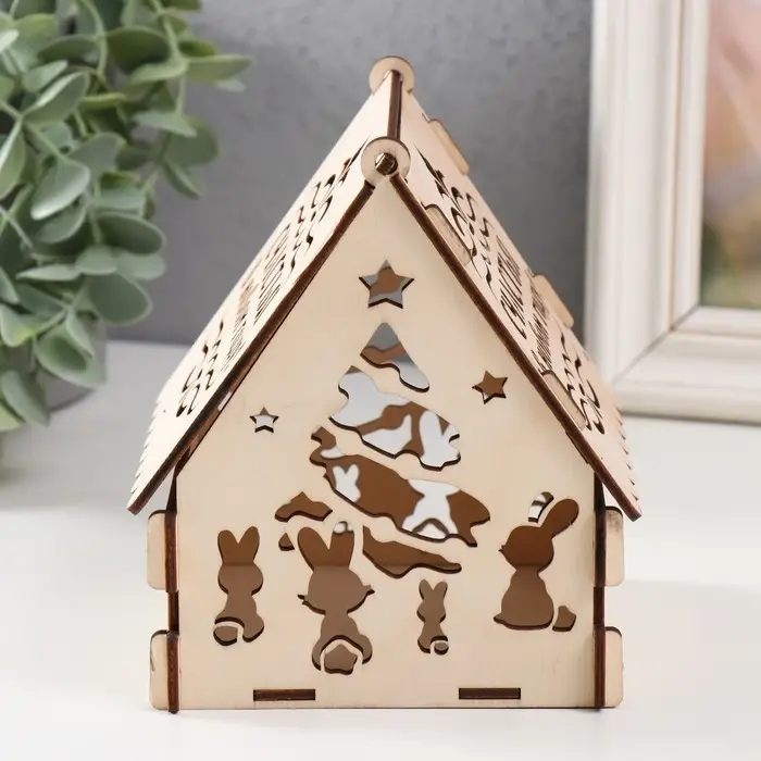 Заготовка новогодняя шкатулка-домик "Зайки" натуральный 12х10х14 см (Новогодний набор 7 деталей) 977