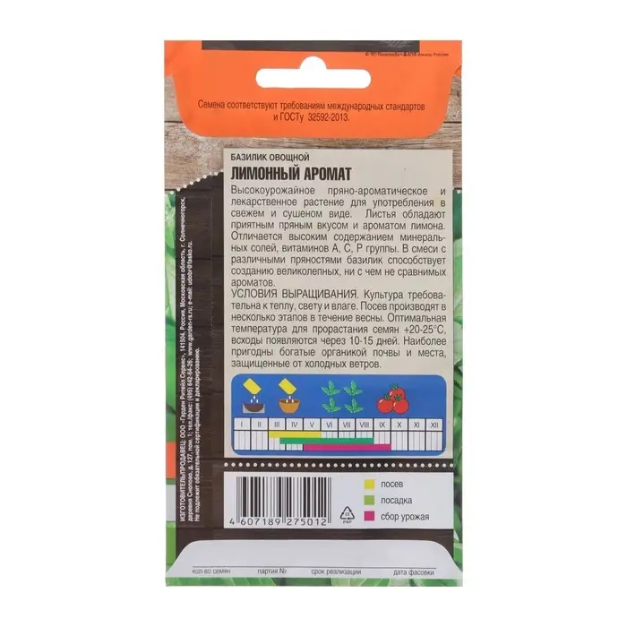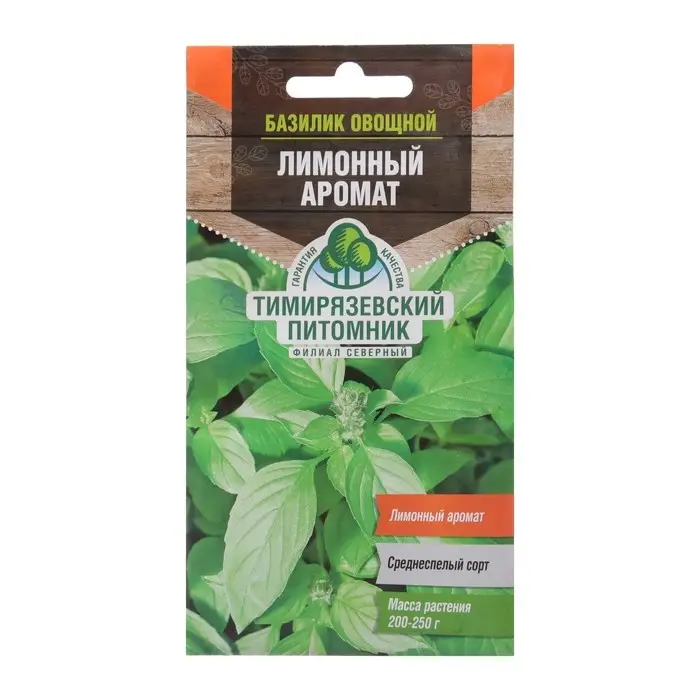 Среднепоздний (60-70 дней от всходов до технической спелости) сорт. Выращивается в рассадной и безрассадной культуре. Посев на рассаду конец марта – начале апреля. Высадка рассады в грунт в начале июня. Растение полупрямостоячее. Лист крупный, ярко-зеленый, гладкий. Стебель светло-зеленый, белесоватый. Масса растения 170-260 г. Аромат сильный, лимонного оттенка. Урожайность зелени 1,9-2,9 кг/м2. Ценность сорта: высокая урожайность, лимонный аромат. Базилик предпочитает хорошо структурированные, богатые гумусом почвы. Нуждается в регулярных поливах. Рекомендуется для использования в свежем виде в качестве салатной зелени, пряно-вкусовой добавки и натурального ароматизатора в кулинарии и при консервировании. Схема посадки 30х30см.