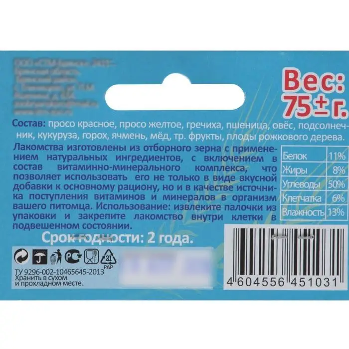 Состав: просо красное, просо желтое, гречиха, пшеница, овёс, подсолнечник, кукуруза, горох, ячмень, мед, тропические фрукты, плоды рожкового дерева.