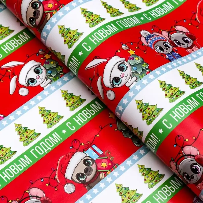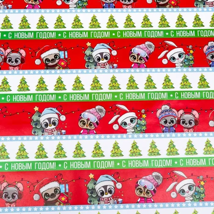 Бумага упаковочная новогодняя глянцевая «Зверята», 70×100 см