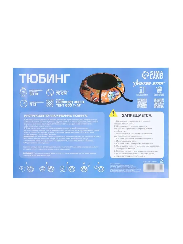 Требования по безопасности: запрещается кататься с трамплинов, по поверхностям с камнями или препятствиями, привязывать тюбинг к транспортным средствам, использовать его на других покрытиях, кроме снежных. Не предназначен для детей младше 3 лет.