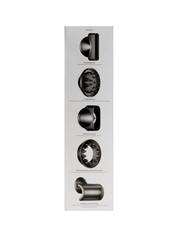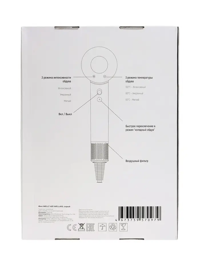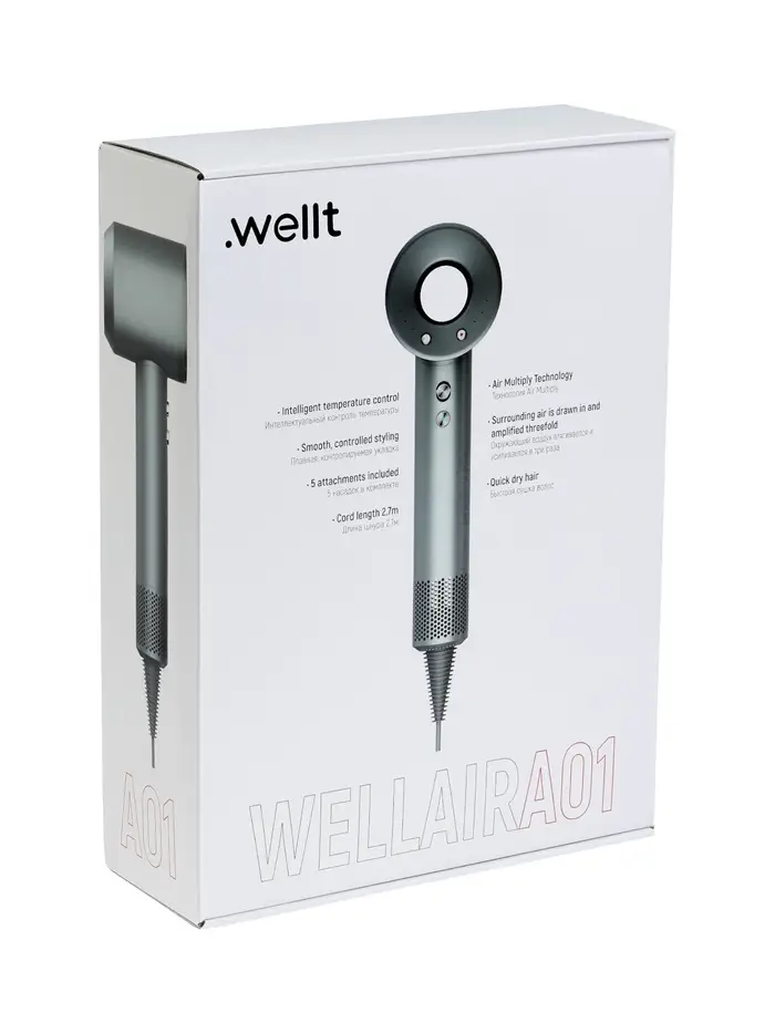 Фен WELLT A01 WELLAIR, 1600 Вт, 5 насадок, 3 скорости, 4 темп. режима, ионизация, серый