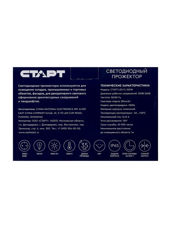 Прожектор светодиодный СТАРТ, 100 Вт, 8500 Лм, 6500К, IP 65