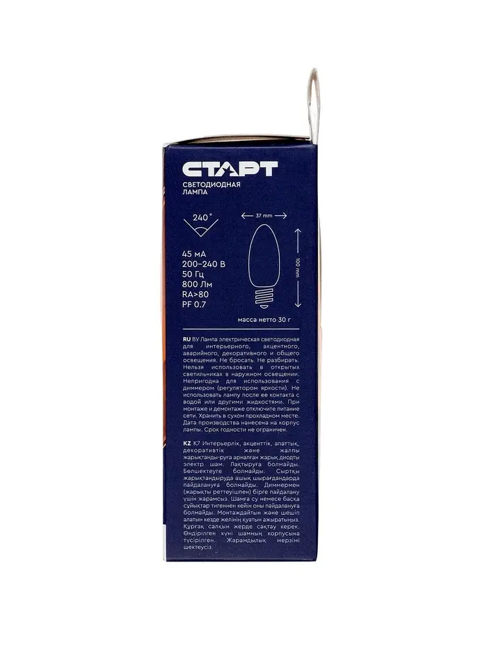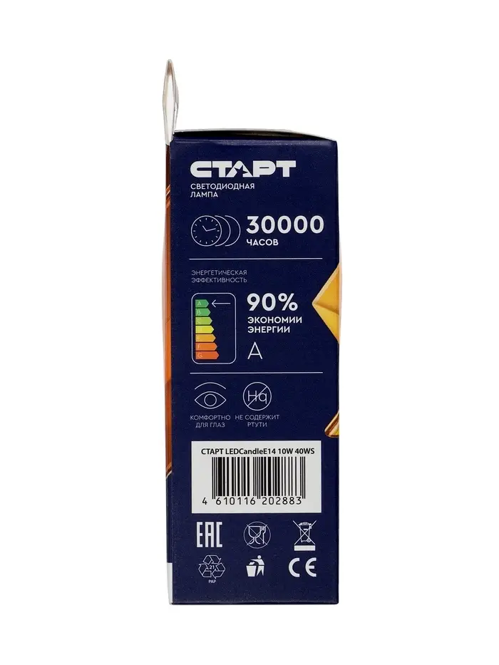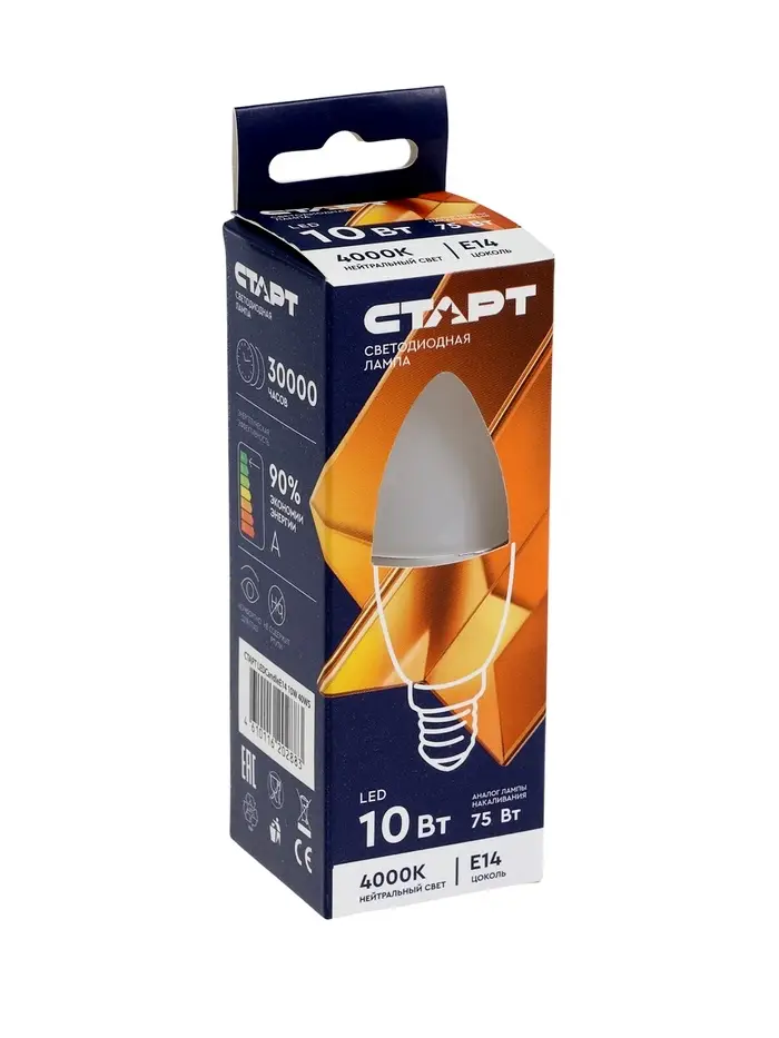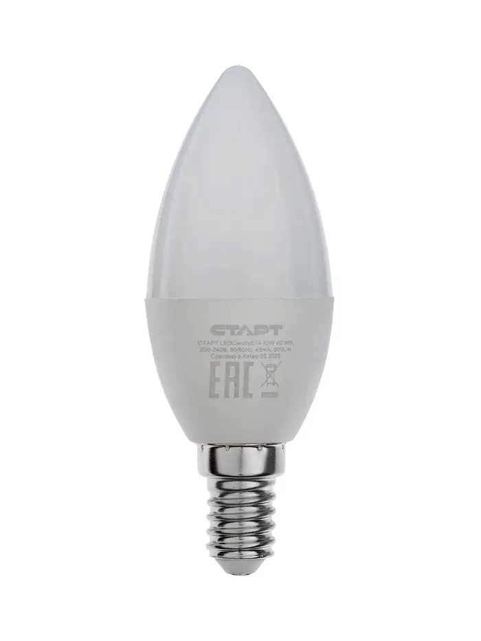 Светодиодная лампа СТАРТ 10 Вт с цоколем E14 и формой «свеча» создаёт комфортное нейтрально-белое освещение с цветовой температурой 4000K и световым потоком 800 лм. Такая лампа отлично подходит для освещения жилых и рабочих помещений, создавая естественное освещение без излишней холодности или теплоты.