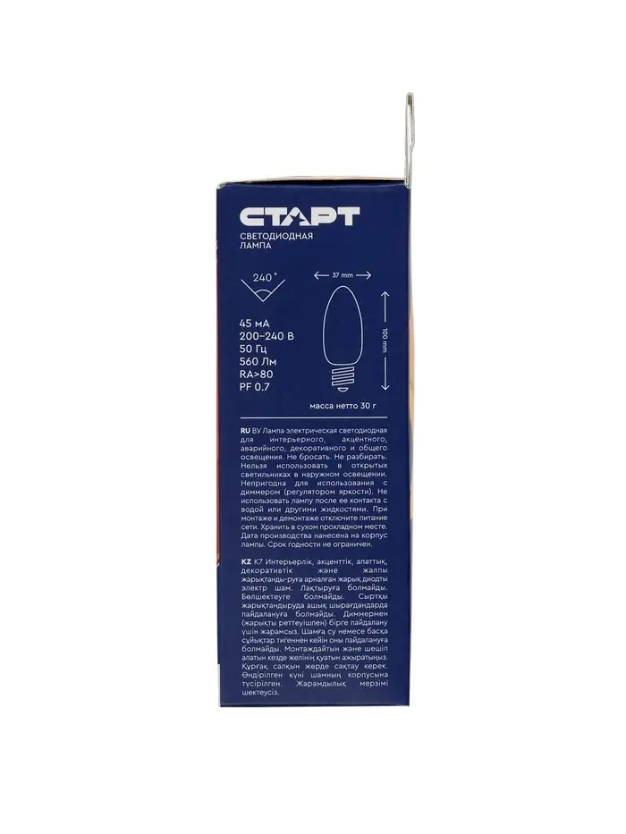 Светодиодная лампа СТАРТ 7 Вт с цоколем E14 и формой «свеча» С37 обеспечивает комфортное нейтрально-белое освещение с цветовой температурой 4000K и световым потоком 560 лм. Такая лампа идеально подходит для создания равномерного и естественного света в жилых и рабочих помещениях, не вызывая утомления глаз.