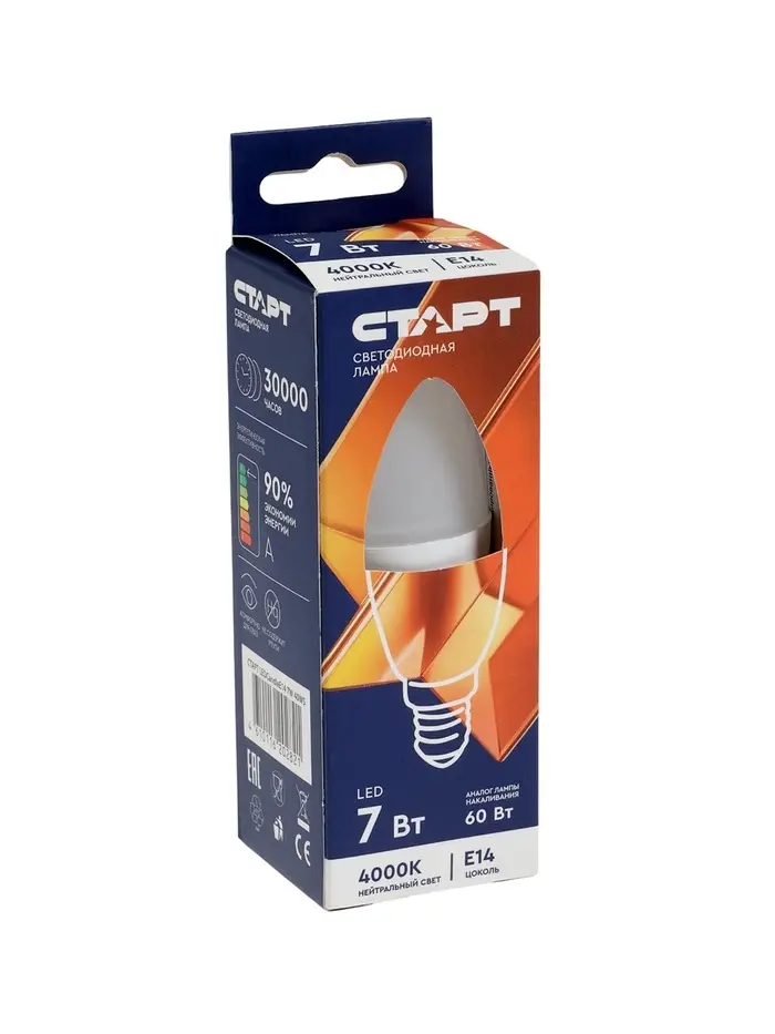 Лампа светодиодная СТАРТ, 7 Вт, Е14, С37, 4000К, 560 Лм, свечение нейтральное белое