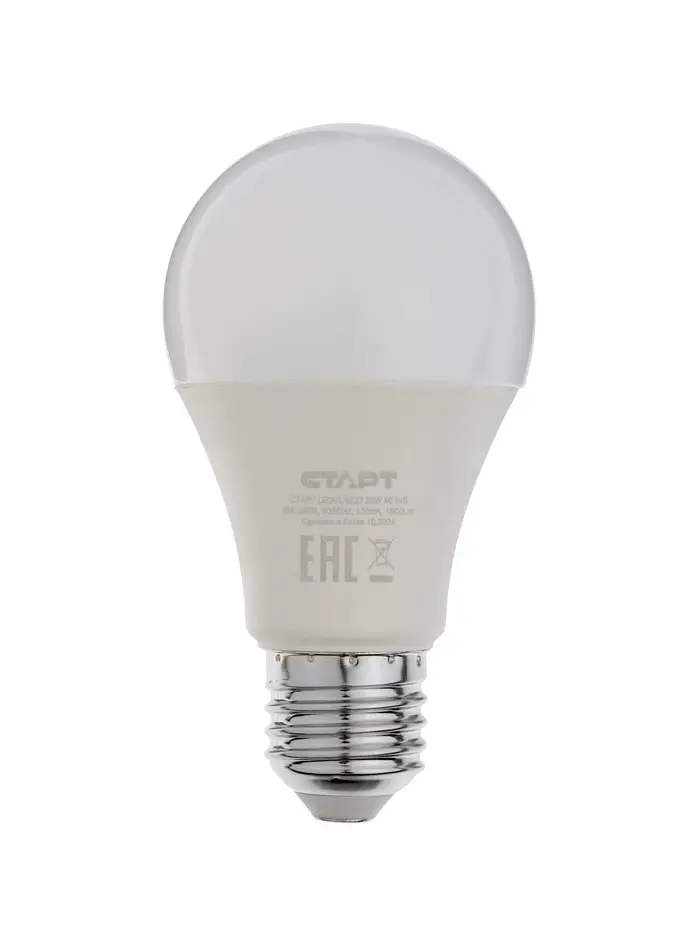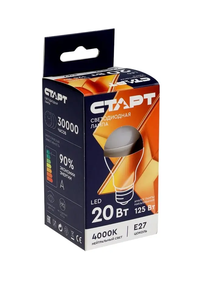 Лампа светодиодная СТАРТ, 20 Вт, Е27, А60, 4000К, 1600 Лм, свечение нейтральное белое