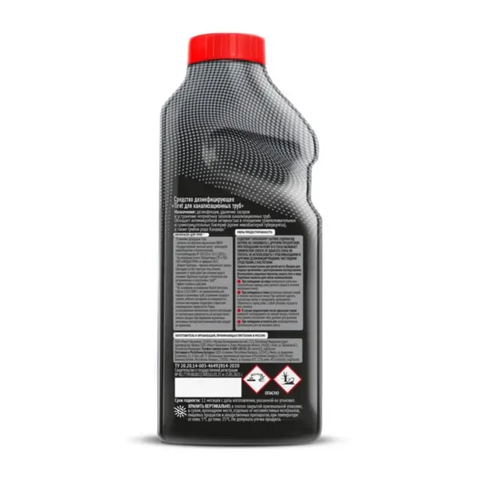 Средство дезинфицирующее для канализационных труб, удаление засоров и устранение неприятных запахов канализационных труб. Обладает антимикробной активностью в отношении грамположительных и грамотрицательных бактерий (кроме микробактерий туберкулеза), а так же грибов рода Кандидада. Идеально подходит и безопасен дляметаллических и пластиковых труб.