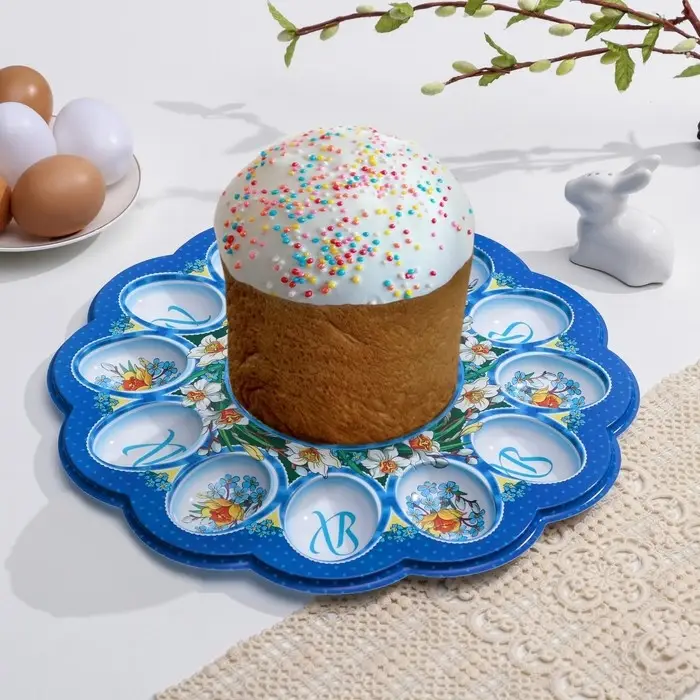 Пасхальная подставка предназначена для праздничного украшения Вашего стола в Светлый День Пасхи. В центре декоративной подставки находится углубление для пасхального кулича диаметром 11,5 см, а по окружности - 12 отверстий для пасхальных яиц. Диаметр декоративной подставки - 30 см.