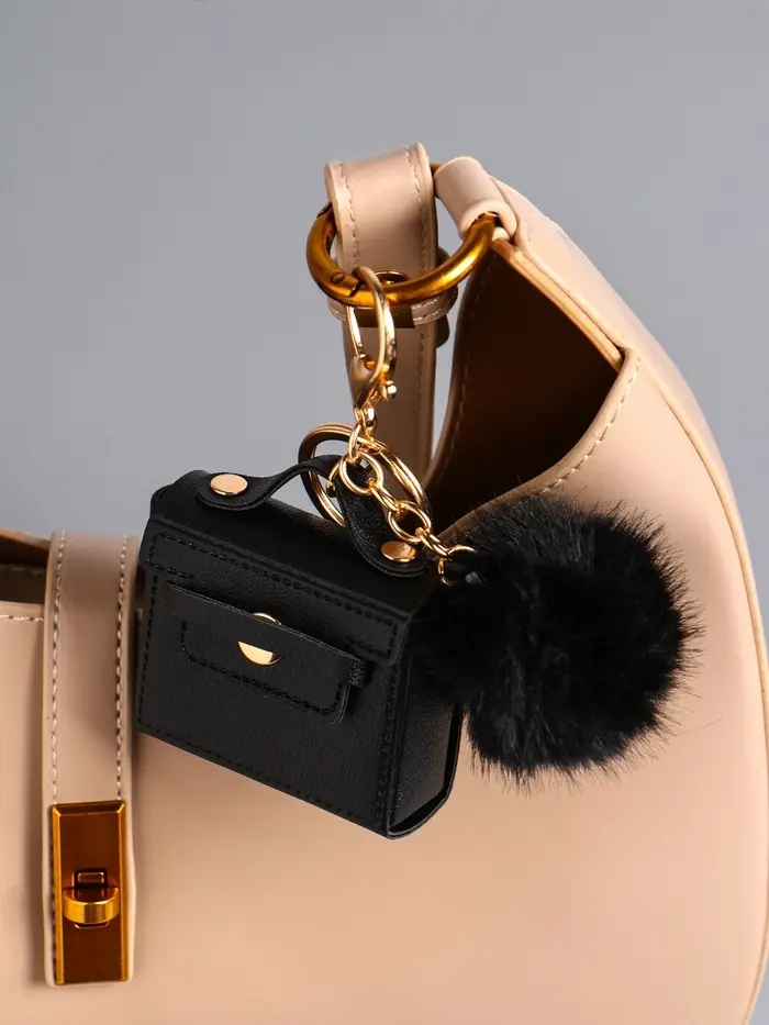 Брелок кожзам с карабином, с пушистиком "Сумочка" чёрный 5,8х2,4х5 см