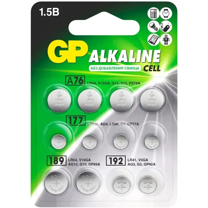 Батарейка алкалиновая GP, ACM02F-12BL(А76 по 4 шт.;164,186,189 192-по 2 шт.); 1.5В,12 шт.