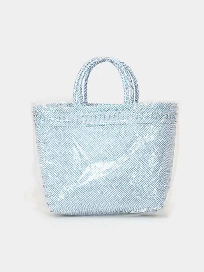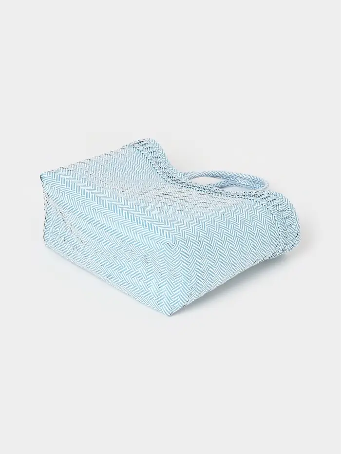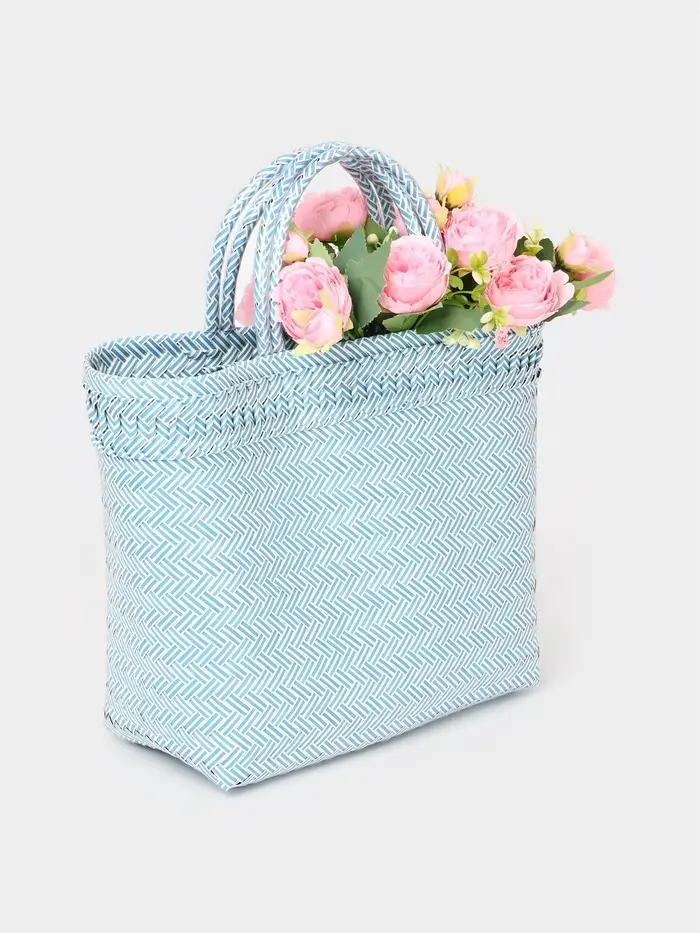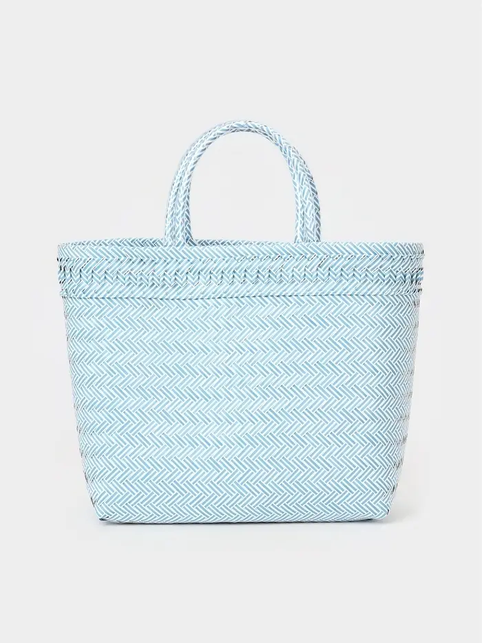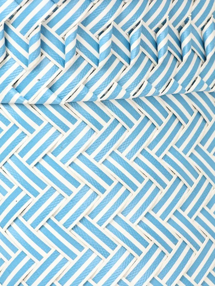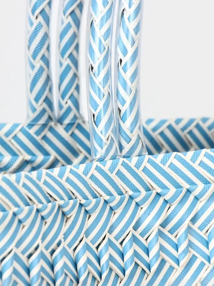 Плетёная сумка бело-голубого оттенка — лёгкий акцент летнего настроения. Её средний размер и жёсткий каркас сохраняют форму даже при заполнении, а открытый верх и ношение в руке или на плече делают её удобной для прогулок, пляжа или похода за фруктами на рынок.