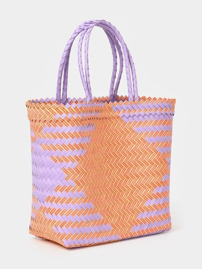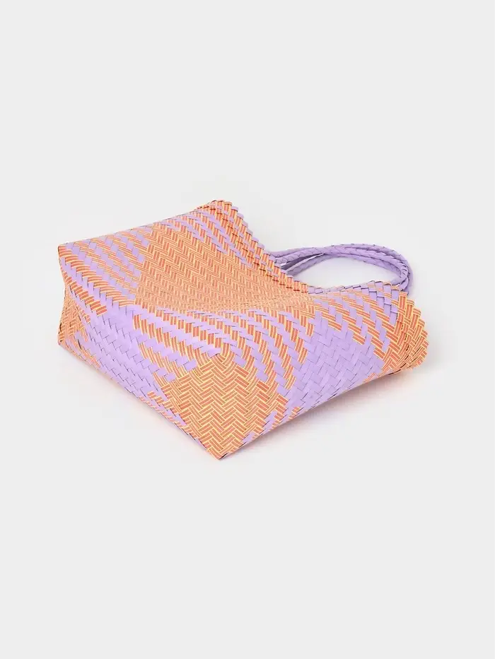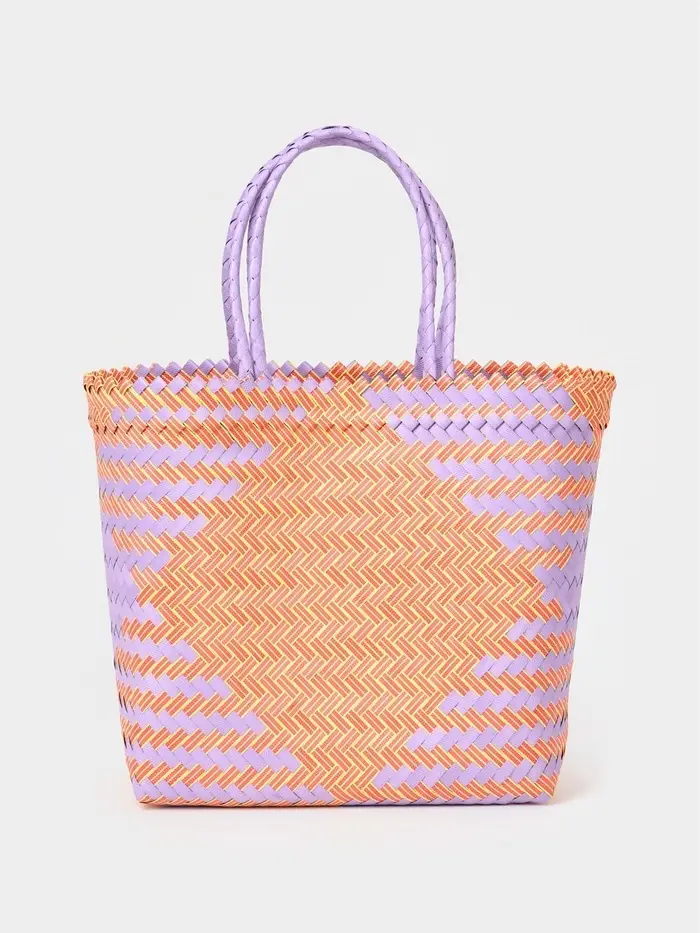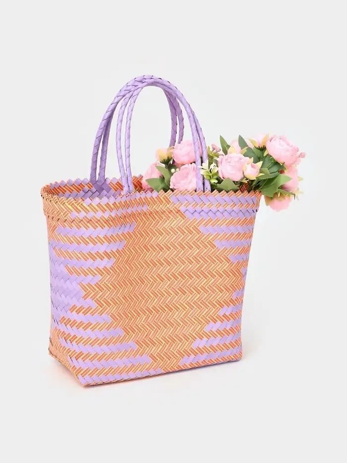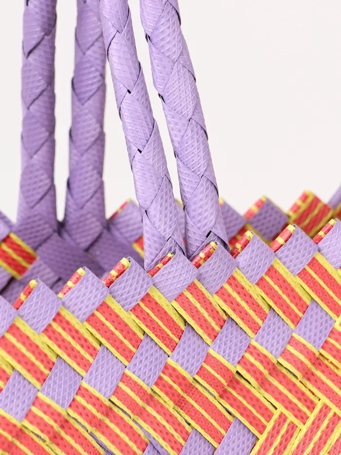Плетёная сумка сиренево-жёлтого оттенка — яркий, но не кричащий акцент летнего дня. Её компактные габариты и жёсткий каркас сохраняют форму даже при активном использовании, а открытая конструкция и ношение в руке или на плече делают её идеальной для прогулок, рынка или пляжа.