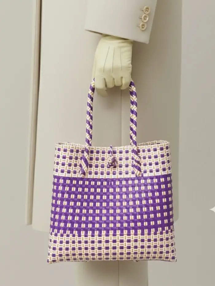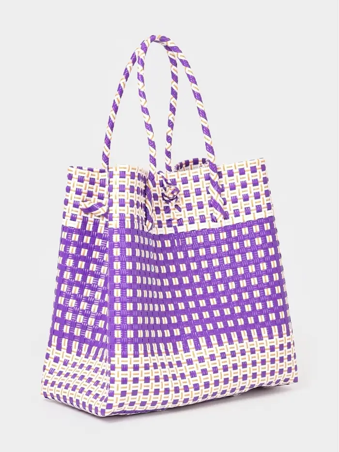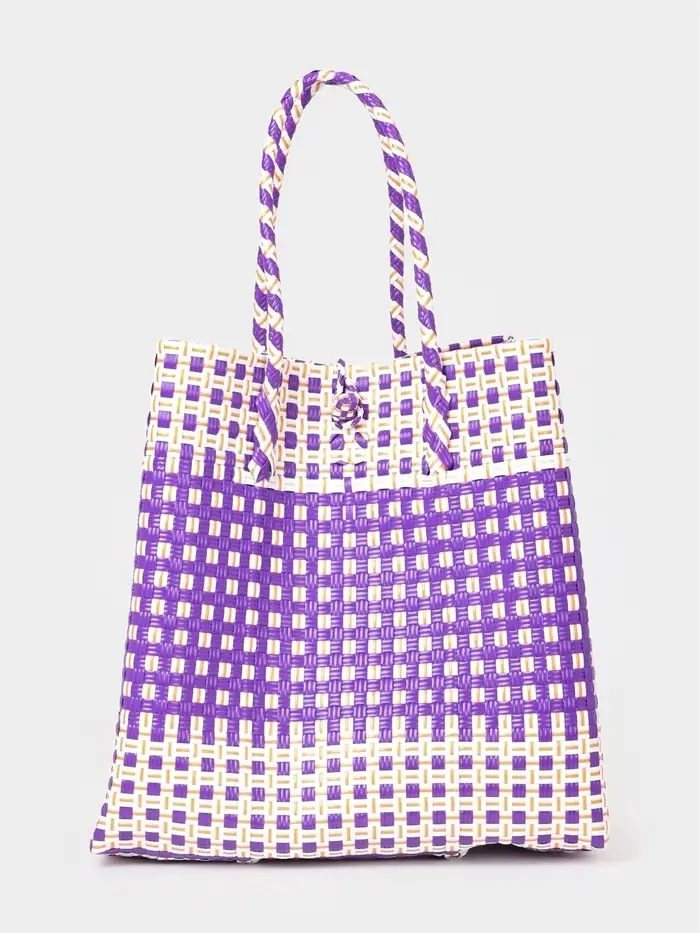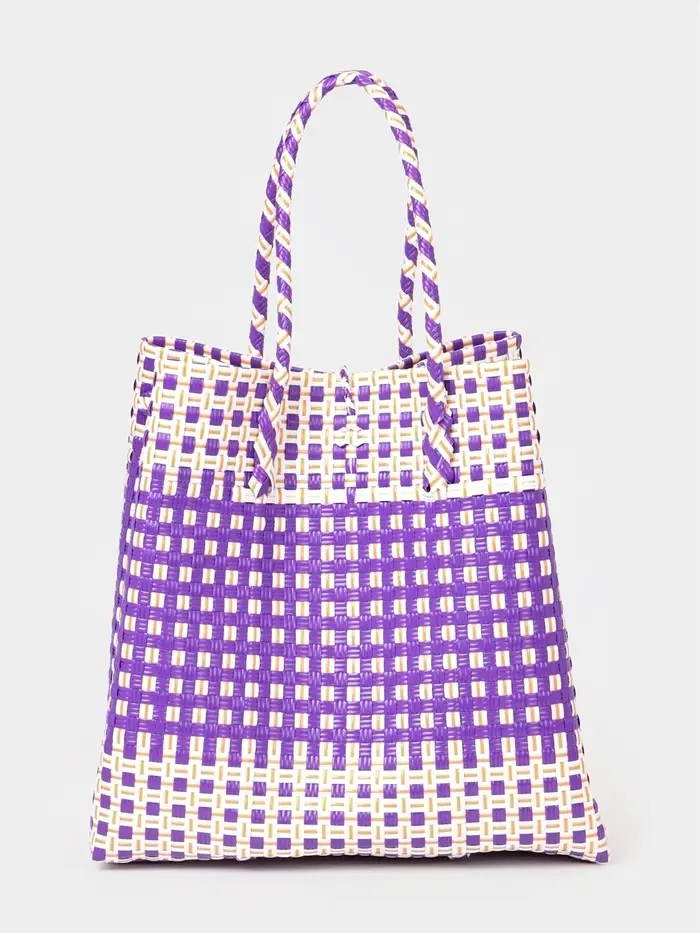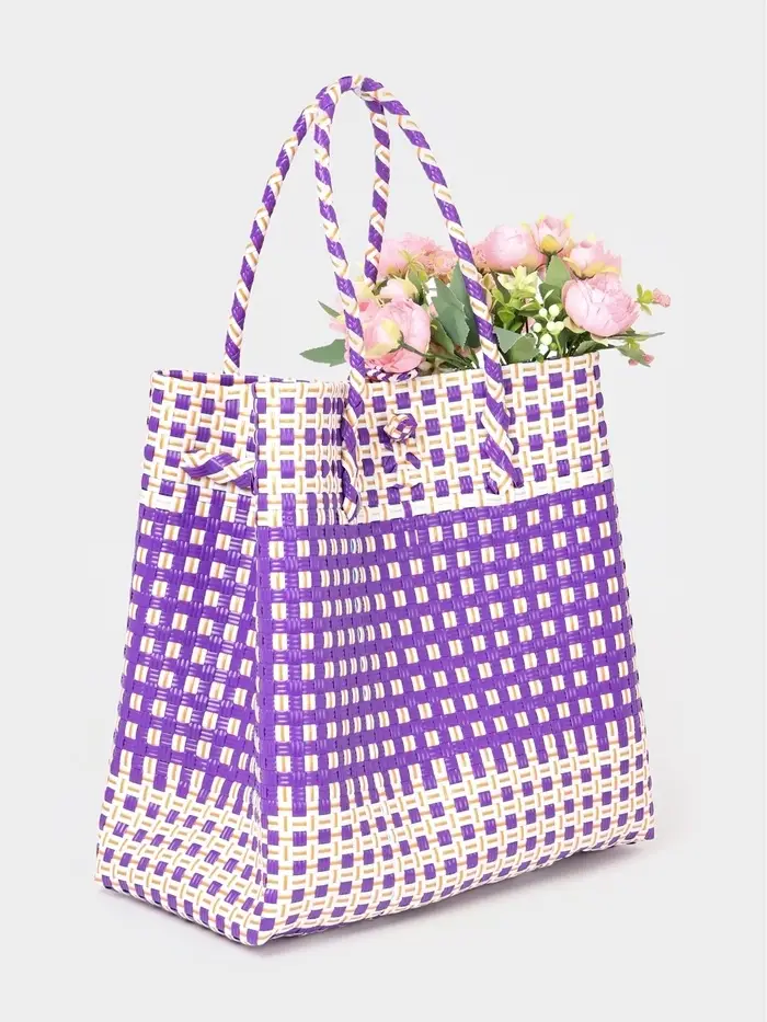 Большая плетёная сумка фиолетово-белого оттенка — практичный спутник не только летом, но и в другие сезоны. Её вместительность и жёсткий каркас делают её надёжной для рынка, пикника, поездки на дачу или повседневных дел, а сдержанная цветовая гамма добавляет образу лёгкости без излишней яркости.