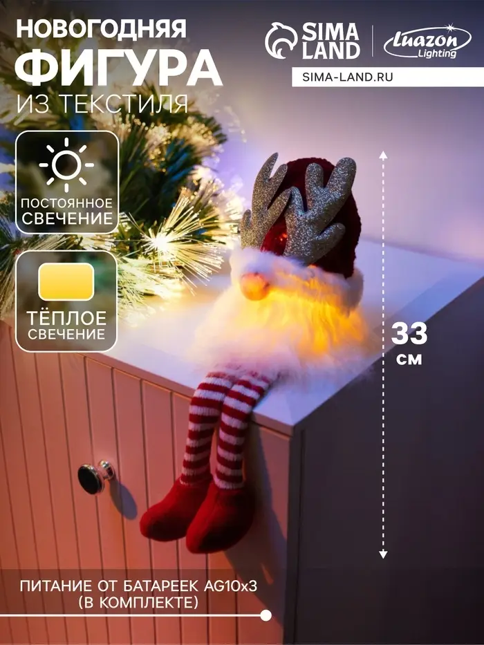 Перед вами очаровательный праздничный аксессуар высотой 33 см — текстильный гном в красной шапочке, излучающий мягкий тёплый свет благодаря светодиоду. Его работа основана на постоянном свечении.