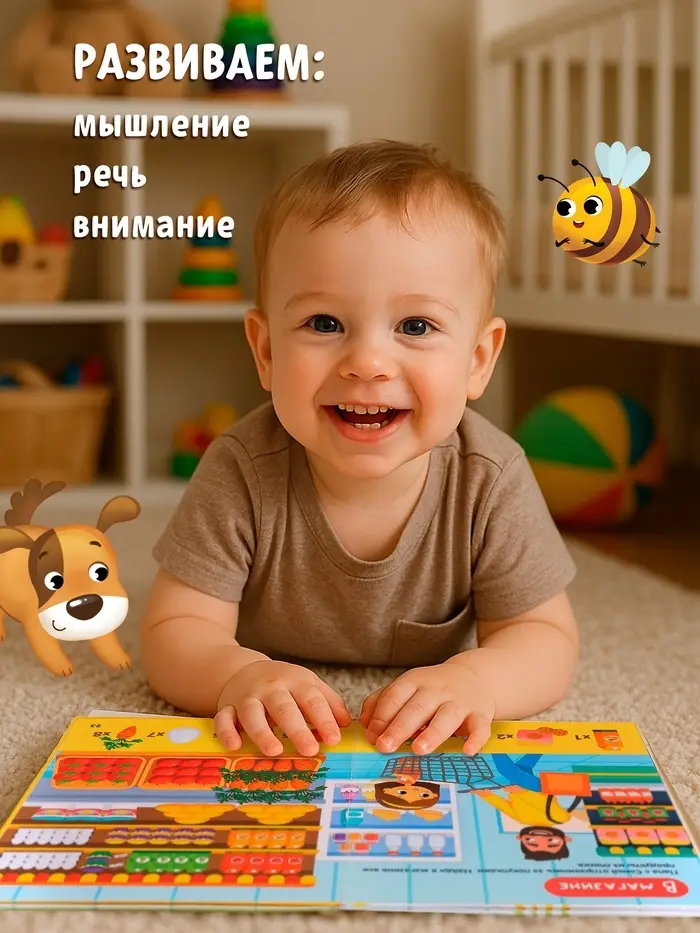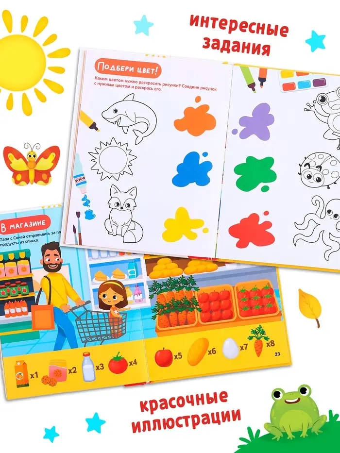 Ребёнок открывает книгу и погружается в мир знаний, где каждая страница — это новое открытие. Это похоже на «путешествие в страну открытий», где каждое задание помогает малышу освоить что-то важное: от узнавания цветов до счёта и изучения животных. Яркие иллюстрации привлекают внимание, а задания стимулируют интерес к обучению. Книга становится не просто источником знаний, но и инструментом для развития мышления и речи.