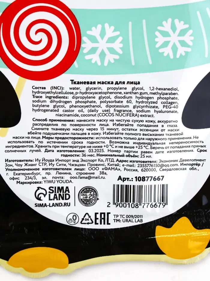 Тканевая маска для лица насыщающая, экстракт кокоса и гиалуроновая кислота, URAL LAB