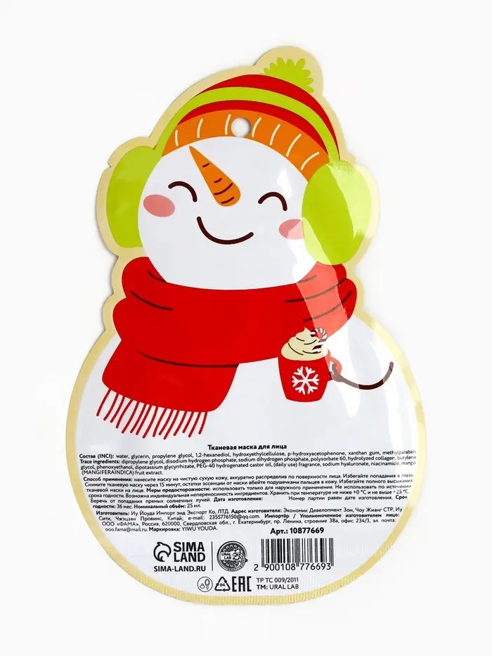 Тканевая маска для лица питательная, экстракт манго и гиалуроновая кислота, URAL LAB