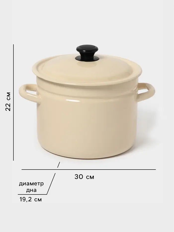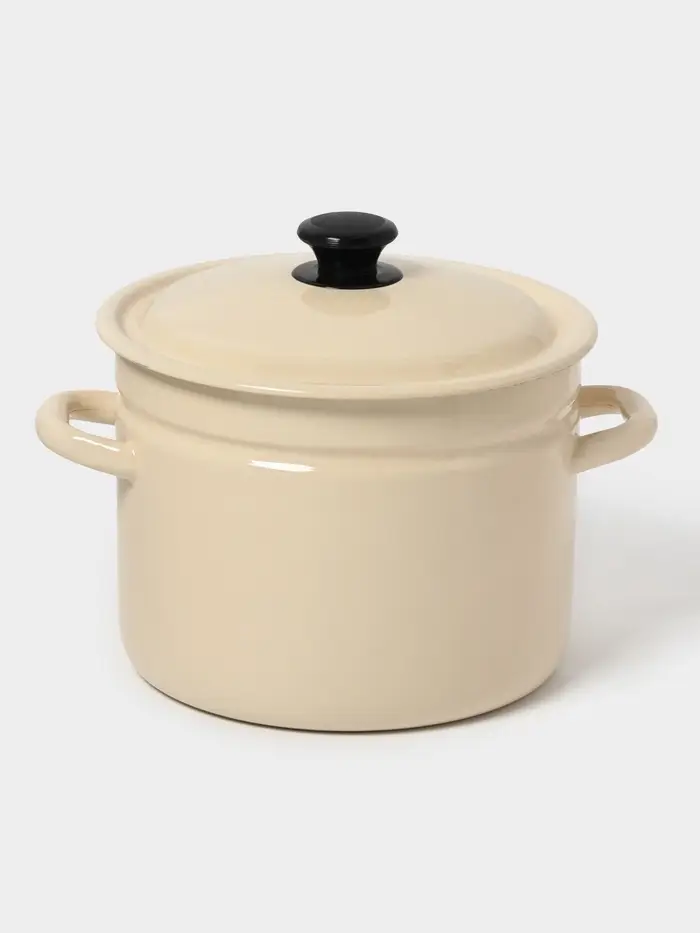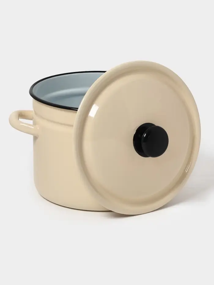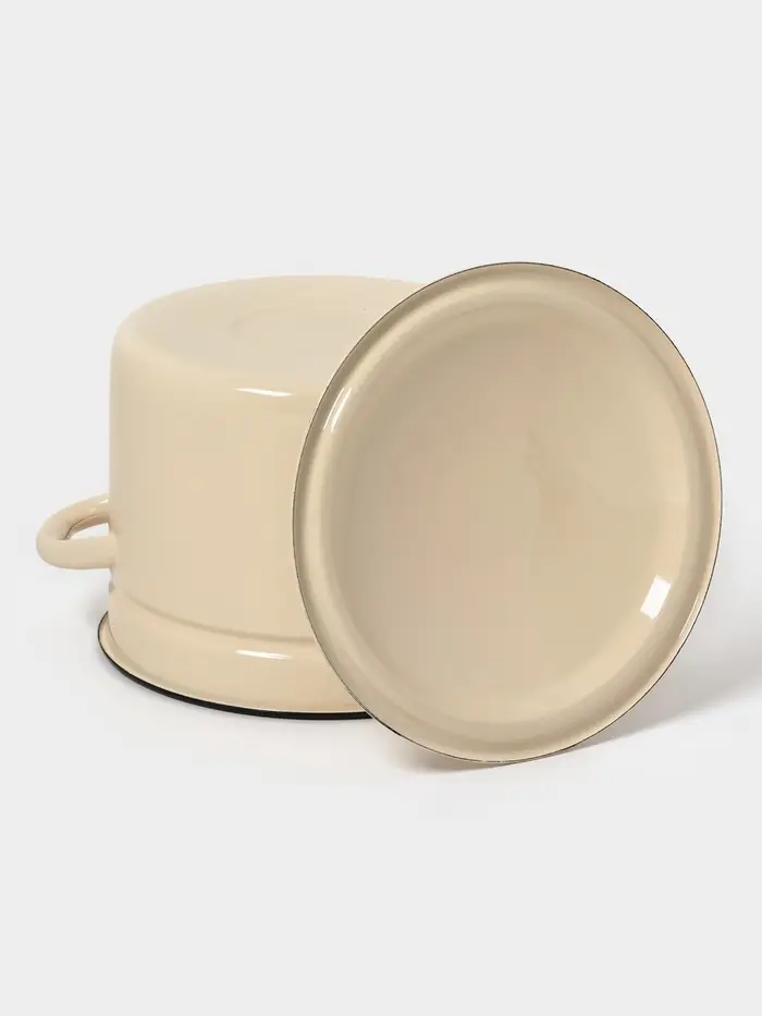 Цвет слоновой кости, гладкая поверхность без рисунка и крышка из той же эмалированной стали делают её практичной, лёгкой в уходе и неприхотливой в хранении.