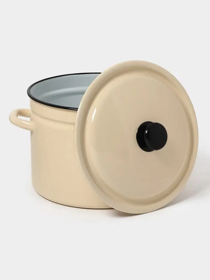 Цвет слоновой кости, гладкая поверхность без рисунка и крышка из той же эмалированной стали делают её практичной в использовании и простой в уходе.