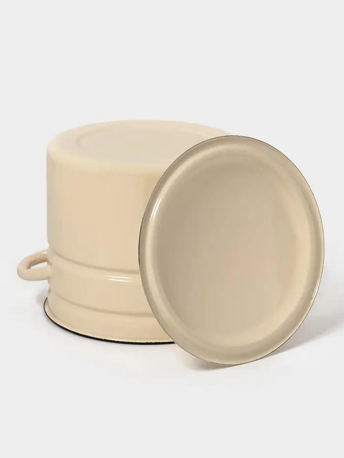 Цвет слоновой кости, гладкая поверхность без рисунка и крышка из той же эмалированной стали делают её практичной в использовании и простой в уходе.