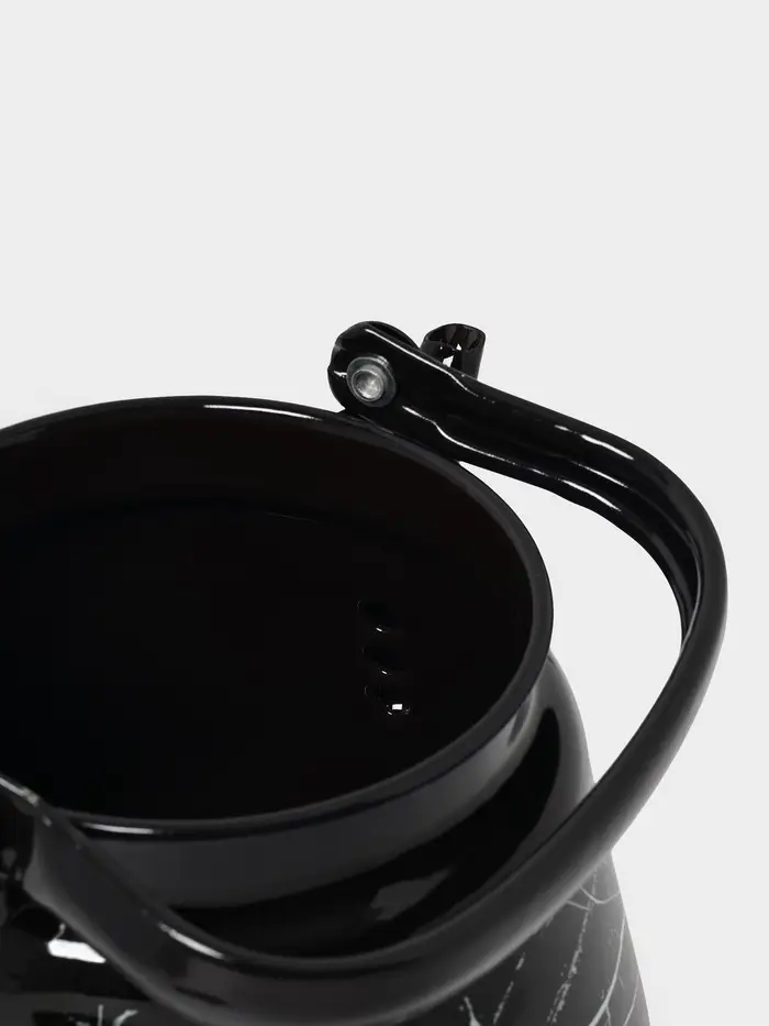 Эмалированный чайник на 3,5 литра с металлической ручкой — надежный спутник на кухне, даче или в бане. Чёрный корпус с изящным узхором под мрамор сочетает дизайн и практичность.