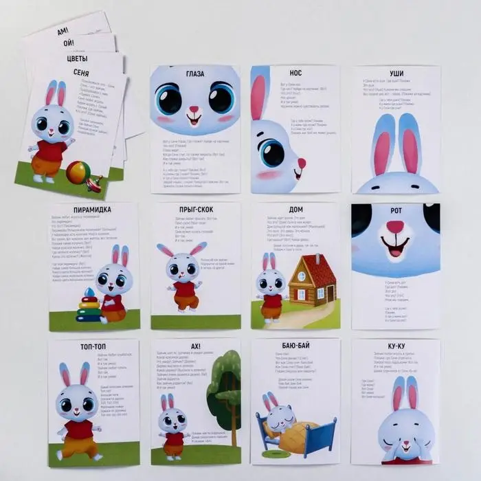 Для развития речи ребёнка мы приготовили 15 карточек-историй про зайчика Сеню. Он поможет изучить части тела, простые поведенческие навыки, эмоции, цвета и не только. Под каждой картинкой вы найдёте варианты беседы с ребёнком: какой вопрос можно задать малышу, и какой ответ ожидать.