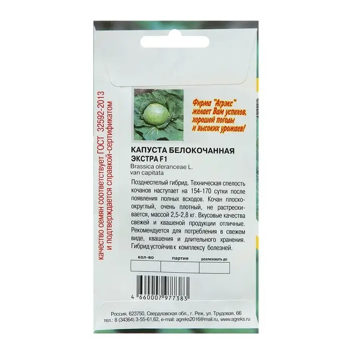 Позднеспелый (150-165 дней) гибрид. Кочаны плоскоокруглые, плотные, гладкие, с хорошей внутренней структурой, массой 2,5-2,8 кг. Наружная окраска листьев зеленая со слабым восковым налетом, на разрезе бело-желтая. Вкусовые качества хорошие. Ценность гибрида: устойчивость к бактериозу, серой гнили и фузариозному увяданию, выравненность кочанов, пригодность к механизированной уборке, хорошая лежкость. Назначение универсально