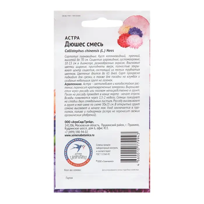 Сортотип Пионовидные. Куст колоновидный, прочный, высотой до 70 см. Соцветия шаровидные, густомахровые, 10-13 см в диаметре, разнообразных окрасок. Язычковые цветки широкие, приподняты вверх, полностью закрывают центр соцветия, состоящий из мелких трубчатых цветков. Цветение длится до 65 дней. Сорт прекрасно подходит для срезки, а также для посадки на клумбах и создания небольших групп на газонах. Агротехника: Астра - светолюбивое и холодостойкое растение, переносит кратковременные заморозки. Выращивается через рассаду или посевом непосредственно в грунт. Посев на рассаду проводят в конце марта - начале апреля. Всходы появляются через 1,5-2 недели. Сеянцы пикируют на стадии двух семядольных листьев. Рассаду высаживают в грунт в мае-июне по схеме 30х25 см. В открытый грунт семена высевают в начале мая. Уход заключается в прополках, поливе и подкормках (астра не переносит свежих органических удобрений). Штрих-код - 4660010779943