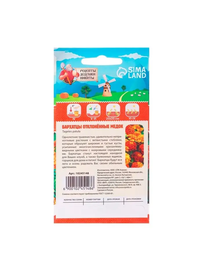 Семена Бархатцев "Медок" — это уникальная смесь, которая подарит вашему саду яркие и разнообразные цветовые акценты. Эти цветы с их насыщенными оттенками и привлекательными формами создадут атмосферу уюта и радости.Бархатцы "Медок" цветут с начала лета до заморозков, радуя глаз своим великолепием.Диаметр цветка: 5-10 см