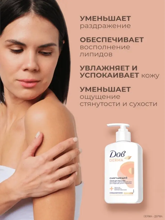 Смягчающий лосьон для лица и тела Дав Derma — это средство для ежедневного ухода за сухой и чувствительной кожей.