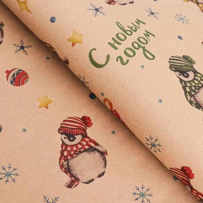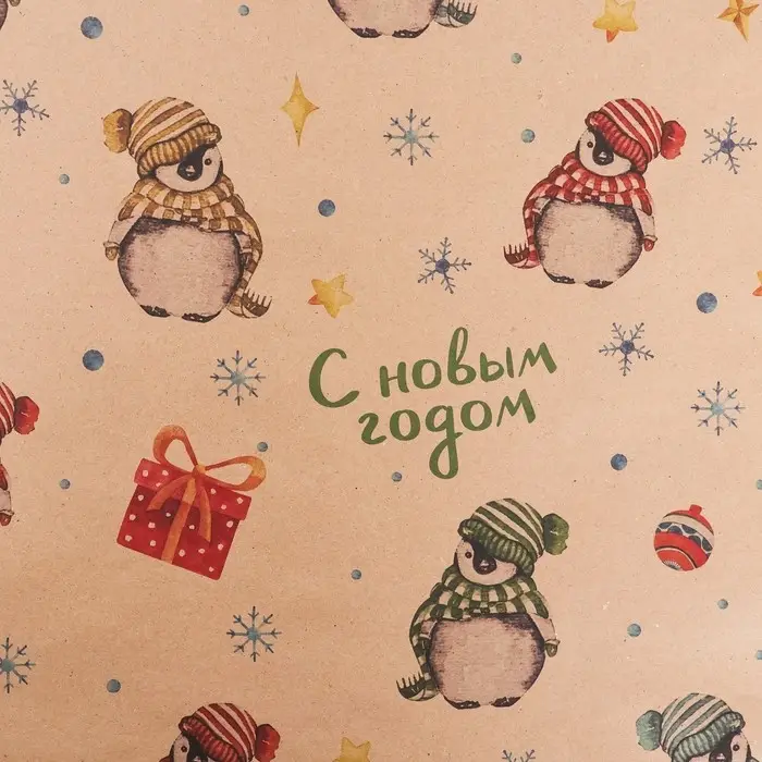 Бумага упаковочная новогодняя крафт бурый "Пингвины", 50 х 70 см.