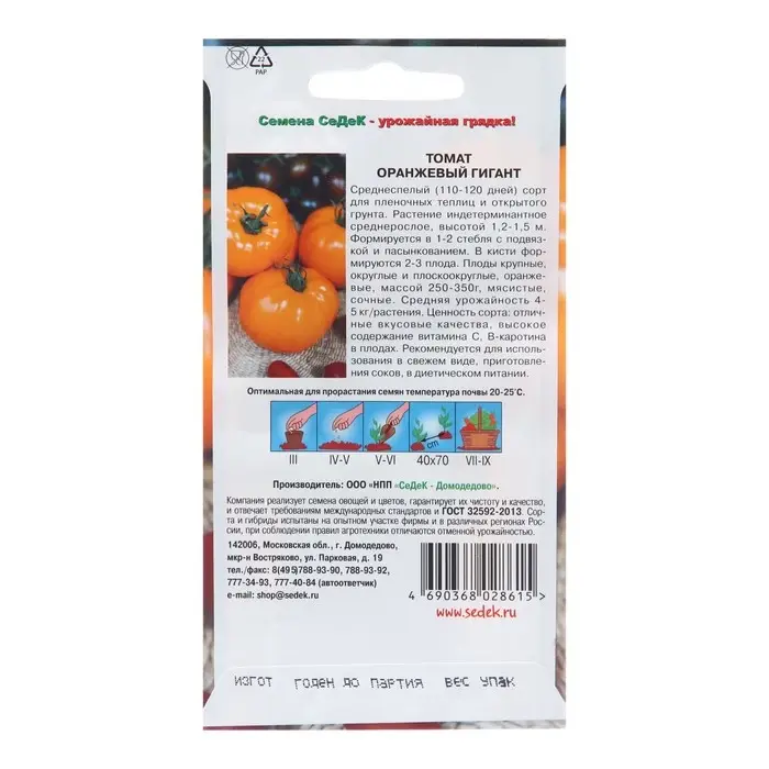 Среднеспелый (110-120 дней) сорт для пленочных теплиц и открытого грунта. Растение индетерминантное среднерослое, высотой 1,2-1,5 м. Формируется в 1-2 стебля с подвязкой и пасынкованием. В кисти формируются 2-3 плода. Плоды крупные, округлые и плоскоокруглые, оранжевые, массой 250-350г, мясистые, сочные. Средняя урожайность 4-5 кг/растения. Ценность сорта: отличные вкусовые качества, высокое содержание витамина С, В-каротина в плодах. Рекомендуется для использования в свежем виде, приготовления соков, в диетическом питании.