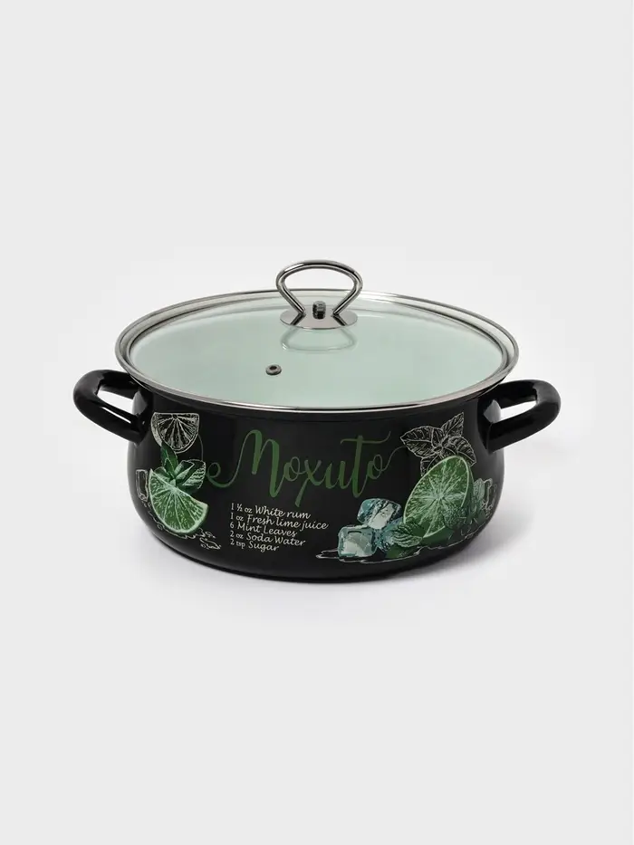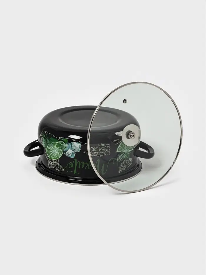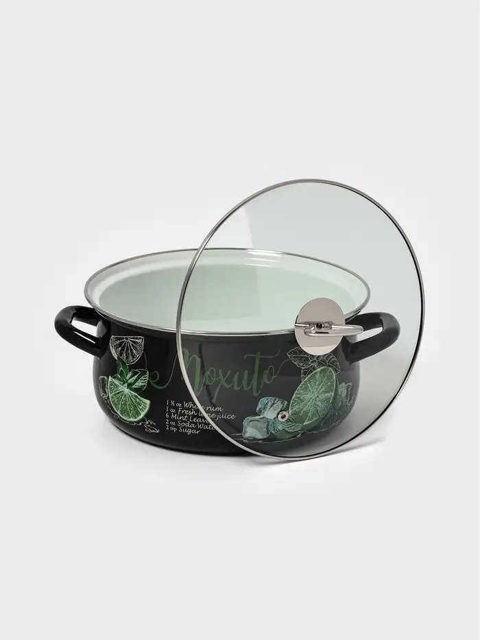 Чёрная эмалированная кастрюля с лёгким узором — для тех, кто ищет баланс между строгостью и свежестью на кухне. Эмалированная кастрюля на 4 л в чёрном цвете — это практичная посуда с характерным рисунком, вдохновлённым лёгкостью летнего «мохито».