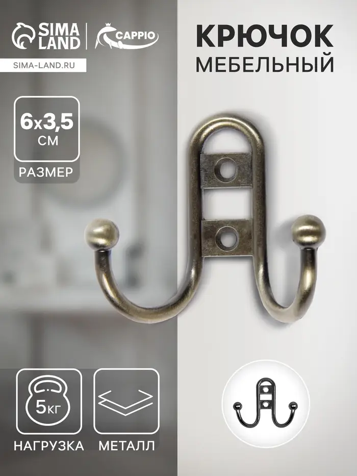 Крючок мебельный ТУНДРА TKd=016, двухрожковый, бронза