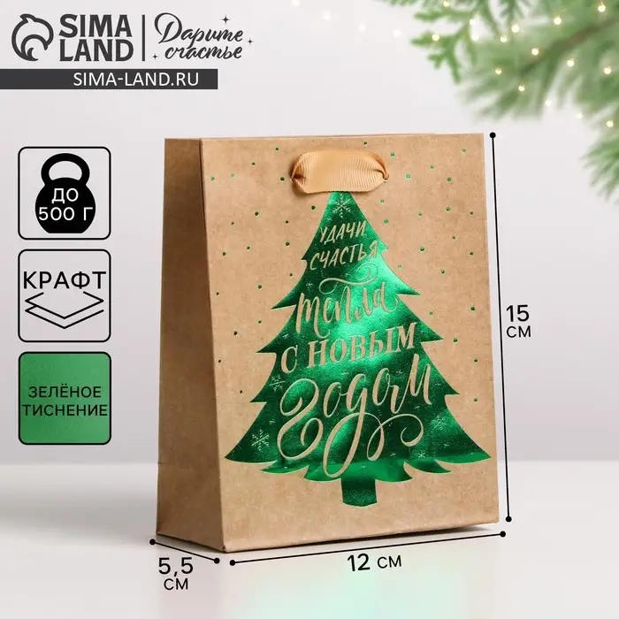 Пакет подарочный новогодний крафтовый «Ёлочка нарядная», S 12×15×5.5 см