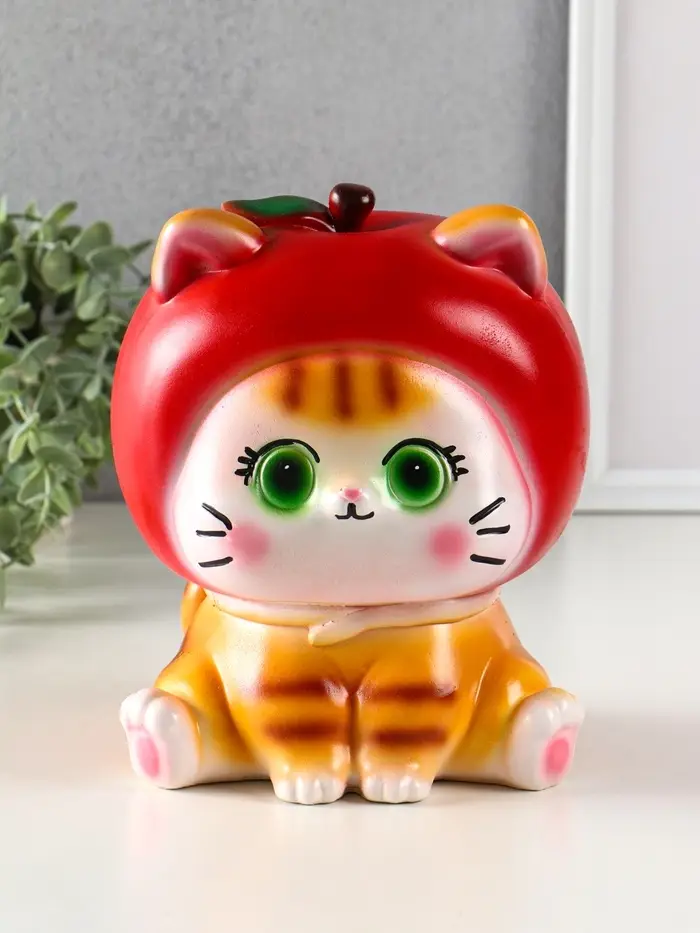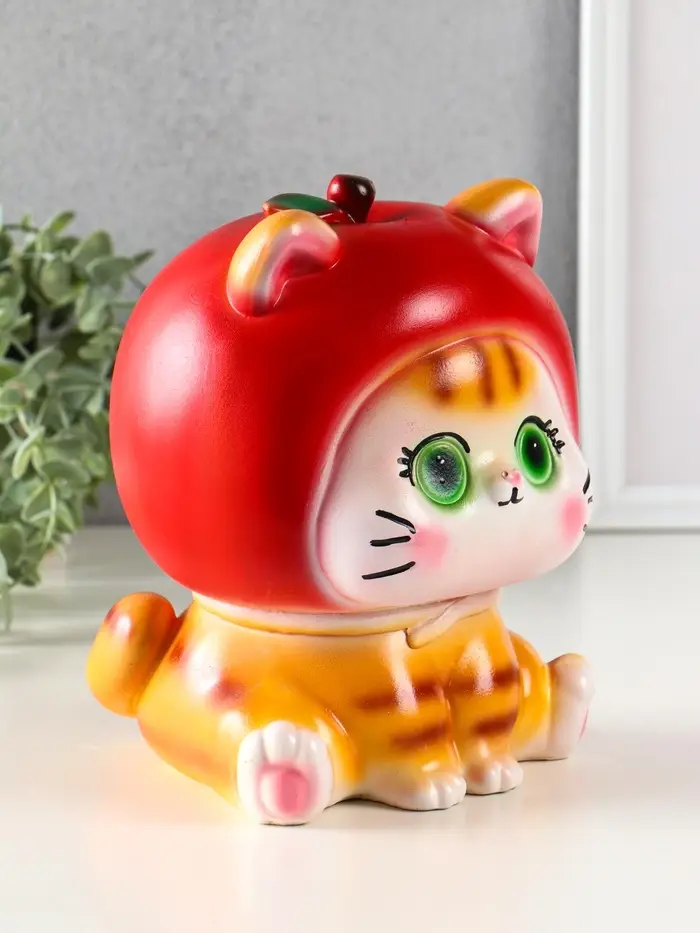 Этот яркий кот-копилка станет верным помощником в накоплении средств и украсит интерьер. Фигурка полосатого кота в яблочном костюме выполнена из гипса и с детализированным окрасом, что делает каждый экземпляр уникальным.