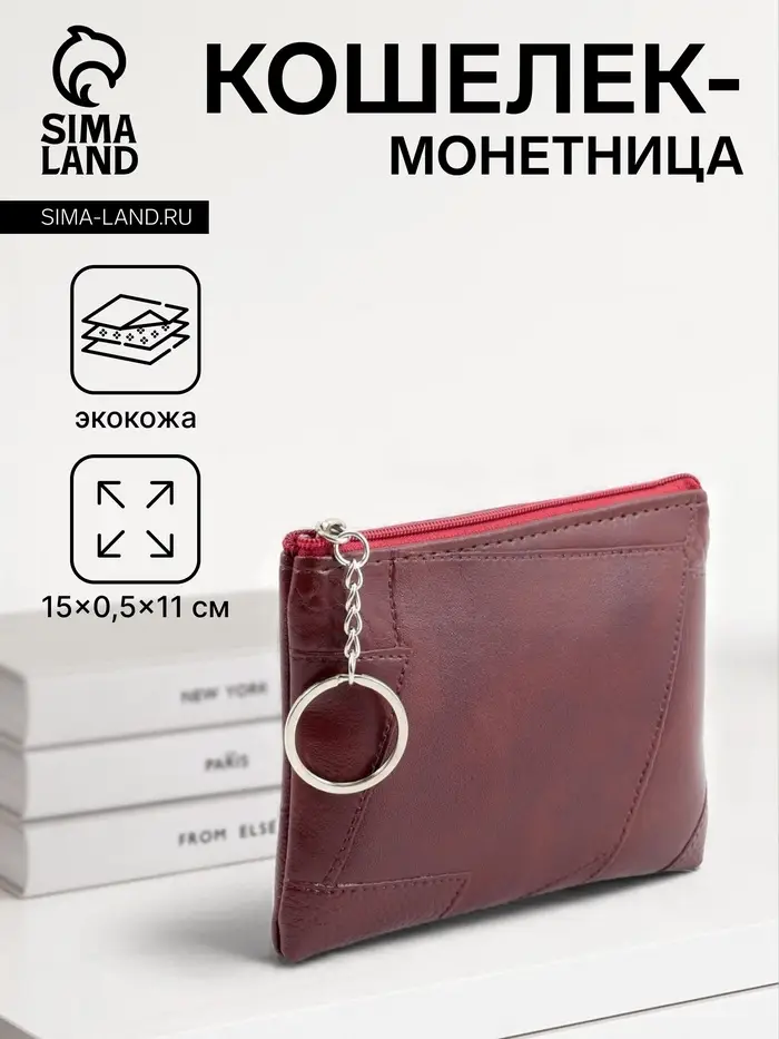 Кошелёк-монетница на молнии, однотонный, 15×0.5×11 см, бордовый