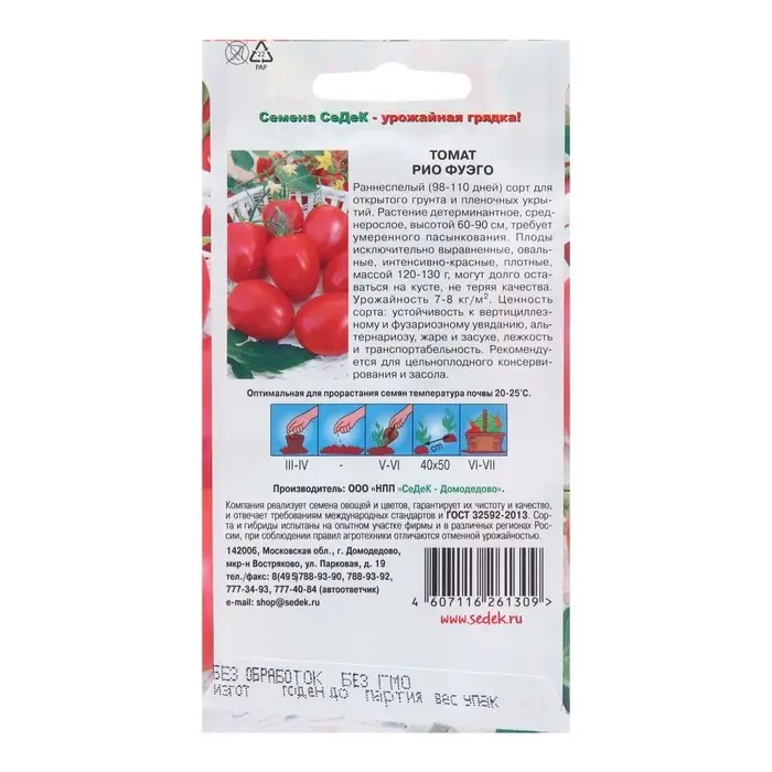 Раннеспелый (98-110 дней) сорт для открытого грунта и пленочных укрытий. Растение детерминантное, среднерослое, высотой 60-90 см, требует умеренного пасынкования. Плоды исключительно выравненные, овальные, интенсивно-красные, плотные, массой 120-130 г, могут долго оставаться на кусте, не теряя качества. Урожайность 7-8 кг/м2. Ценность сорта: устойчивость к вертициллезному и фузариозному увяданию, альтернариозу, жаре и засухе, лежкость и транспортабельность. Рекомендуется для цельноплодного консервирования и засола.