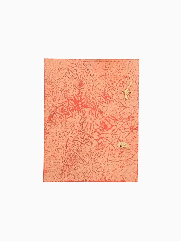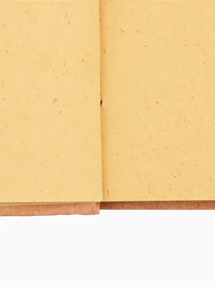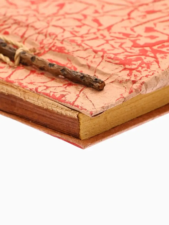 - Обложка из пальмового листа с текстурой плетения и однотонным бежево-красным дизайном приятна на ощупь.