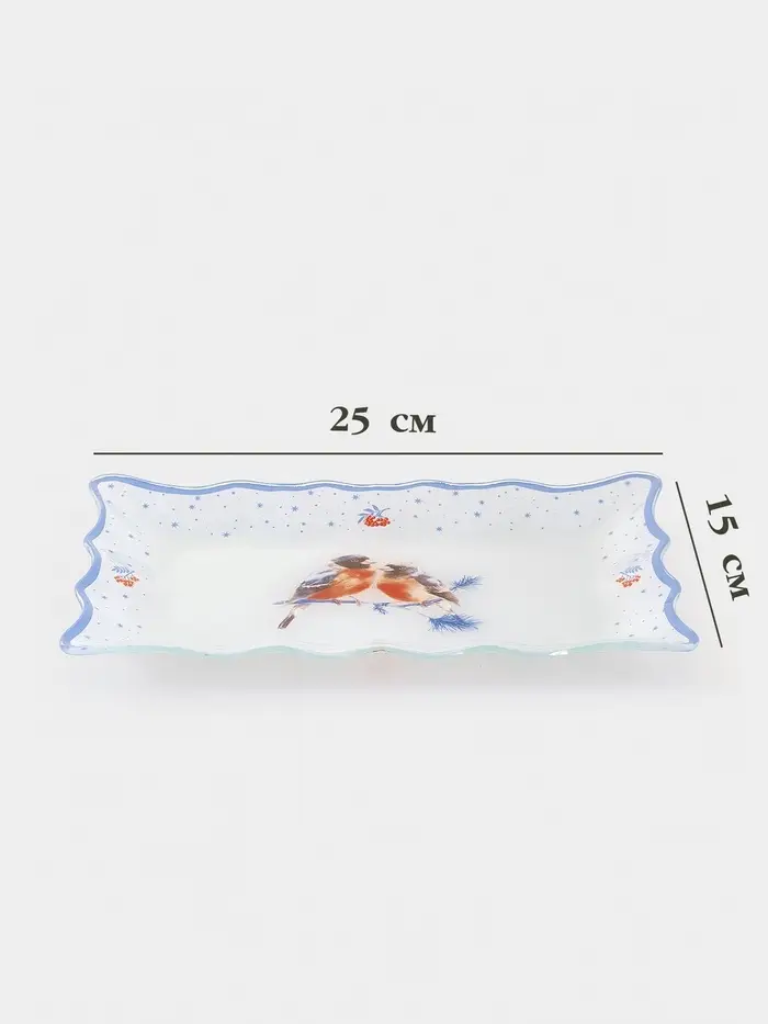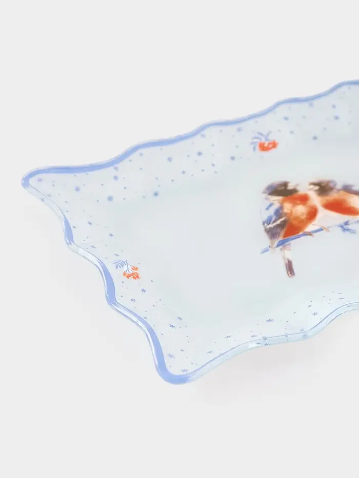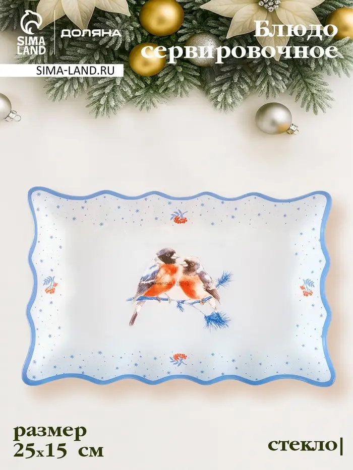 Блюдо сервировочное новогоднее Доляна «Снегири на ветке"», 25×16 см, стекло, белое, голубое