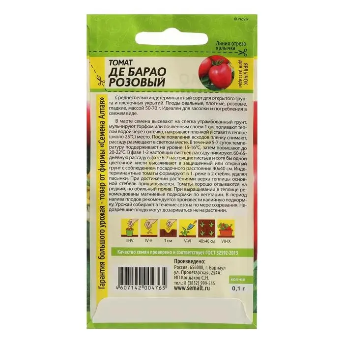 Среднеспелый индетерминантный сорт для открытого грунта и пленочных укрытий. Плоды овальные, плотные, розовые, гладкие, массой 50-70 г. Идеален для засолки и потребления в свежем виде. В марте семена высевают на слегка утрамбованный грунт, мульчируют торфом или почвенным слоем 1 см, поливают теплой водой через ситечко, накрывают пленкой и ставят в теплое (около 25°С) место. После появления всходов пленку снимают, рассаду размещают в светлом месте. В течение 5-7 суток температуру поддерживают на уровне 15-16°С, затем повышают до 20-22°С. В фазе 1-2 настоящих листьев рассаду пикируют. 60-65-дневную рассаду в фазе 6-7 настоящих листьев и хотя бы одной цветочной кисти высаживают в защищенный или открытый грунт с соблюдением посадочного расстояния 40х40 см. Индетерминантные томаты формируют в 1, реже в 2 стебля, удаляя пасынки. При достижении растениями верха теплицы основной стебель прищипывается. Томаты хорошо отзываются на редкий, но обильный полив. При выращивании в теплице рекомендованы магниевые подкормки по вегетации. В период налива плодов рекомендуется произвести калийную подкормку. Урожай собирают в течение сезона по мере созревания. Недозревшие плоды могут дозариваться не на растении.
