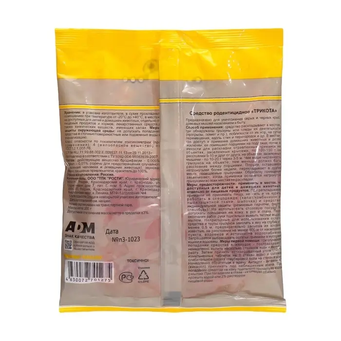 Мягкая масса в виде теста, содержащая Активное действующее вещество и комплекс привлекателей, упакована в индивидуальные пакетики из фильтр-бумаги которые позволяют легко дозировать приманку и не соприкасаться с ней .