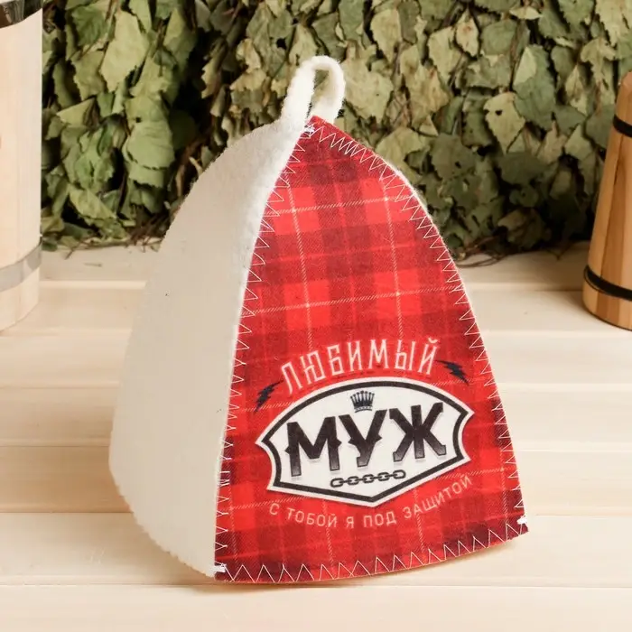 Шапка для бани "Классическая" с термопечатью "Любимый муж (красный фон)"