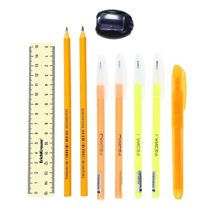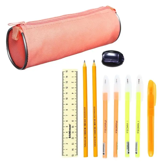 Поставляется с наполнением - 9 предметов ( 4 ручки, линейка, точилка, 2 карандаша, тектовыделитель).