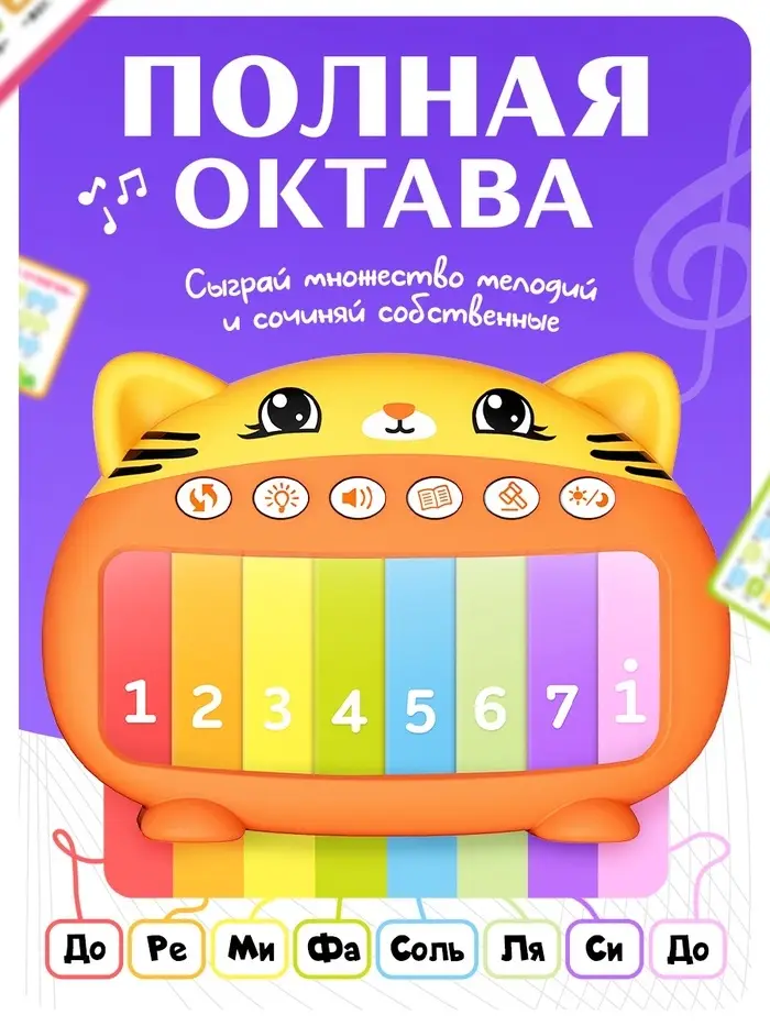 Пианино музыкальное «Весёлый котёнок» — обучающая игрушка для детей от 3 лет. Корпус в виде котёнка, 8 цветных клавиш с подсветкой. В комплекте 10 карточек с мелодиями — ребёнок играет, нажимая клавиши по цветам и цифрам.