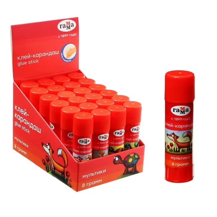 Клей-карандаш ПВП ГАММА серии "Мультики" – отличный помощник на уроках труда и занятиях творчеством! Вес – 8 граммов. Клей белого цвета легко и равномерно наносится на поверхность, что позволяет экономично его расходовать. Клей быстро высыхает. Позволяет хорошо склеивать изделия из бумаги, картона, фотографии. Комфортен в использовании: не оставляет следов на одежде и легко смывается водой. Он безопасен для детей, так как состоит из натуральных ингредиентов и не содержит растворителей. Круглый корпус удобно лежит в руке. Поставляется в дисплей-боксах.